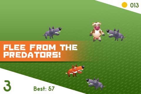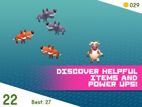 Can you manage to escape the beasts for as long as possible to save your herd? Swipe your finger across the screen to move the cow and escape their claws. The longer you stay alive, the higher your score! Help is delivered in the form of power ups and items which slow down your enemies or make them peaceful. But be careful! Of course, they don’t last forever...