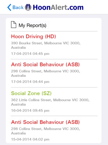 Hoon Alert is a phone or tablet application which combines mapping technology and ordinary people to track and help eradicate serial hoon driving and behaviour activity. With just a few simple clicks, you can report Hoon Driving, Hoon Behaviour and Social Zones (where Hoons are not). A powerful search feature is available so you can search all activities recorded by all users all over the world. Create your own unique "USERNAME ID" and set up an account within minutes. This application does not publicly list hoon details submitted and does not presume guilt. This application through other users provides historical evidence of Hoon hotspots which can then be used by law enforcement to target trouble areas.
