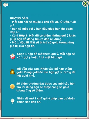 Bạn sẽ có một gợi ý từ một câu hỏi, nếu bạn giải được đáp án từ gợi ý đó, bạn sẽ được điểm tối đa. Còn nếu bạn không thể giải, bạn có còn đến 9 quyền trợ giúp, chính là các hộp bí mật chứa các câu gợi ý. Bạn mở từng hộp sẽ có thêm gợi ý.