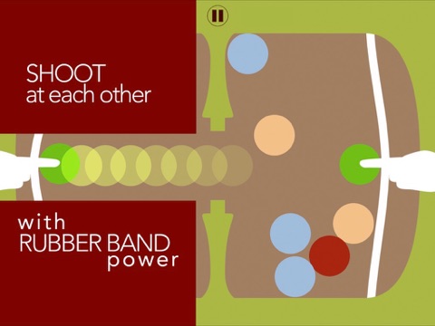2 players, half side of the board each, they clash by throwing discs at each other with elastic band thrust power.