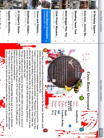 This is a fun and entertaining app for people with an interest in London and some of its "horrible" history. Despite my many trips to London, lots of places with which I am not familiar are included. Even if you dont plan to go to London, this app provides interesting reading material. If you do plan to travel, you can find new and unusual places to see.