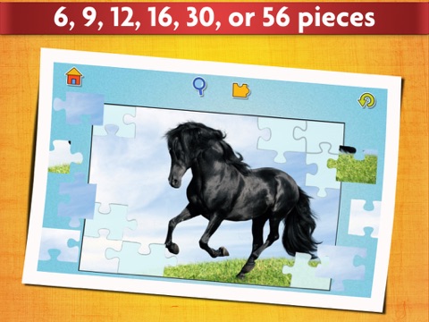 With 6 difficulty levels you can make sure the puzzle suits you or your children, no matter how old they are. From the 6-piece version which offers simple fun for toddlers, to the 56-piece version for the more determined older kids (and that includes you, mom and dad!). Adjustable backgrounds also allows you to hide or reveal the image of the horse youre trying to finish!
