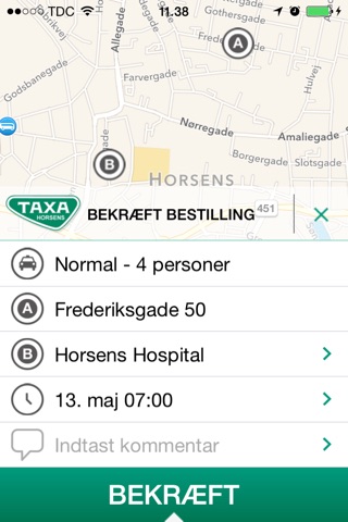 Når du åbner appen, finder den din nærmeste adresse. Flyt kortet eller indtast din afhentningsadresse for at blive hentet et andet sted end der, hvor du er lige nu. Kræver din afhentningsadresse lidt ekstra forklaring? Så indtaster du bare en besked til chaufføren.
