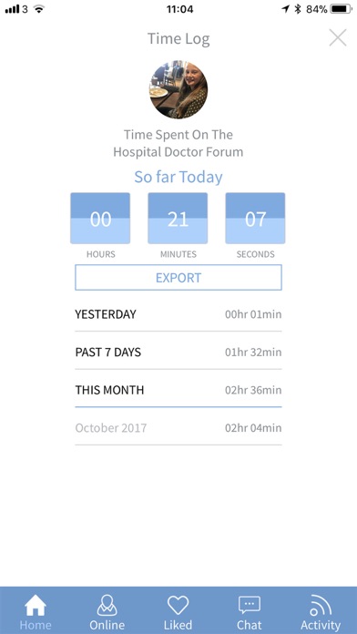 Features include a log of time spent on the app that can be exported.