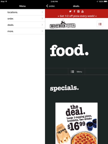 HotBox Pizzas app gives you easy access to ordering, locations, menu, and keeps you up to date with HotBox specials and promotions. Download the HotBox Pizza app. We think its pretty cool, and youre pretty cool, so its a good match. Plus, we spent a lot of money on it so please download it so that we can feel good about it.