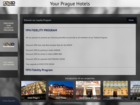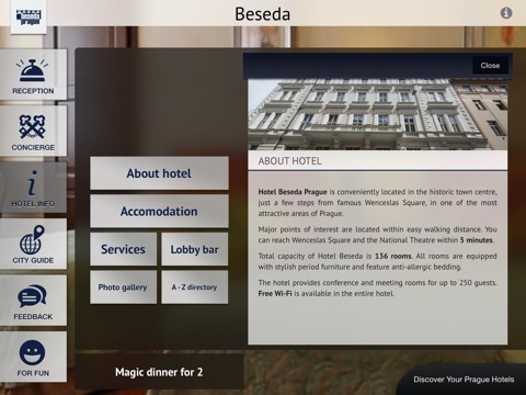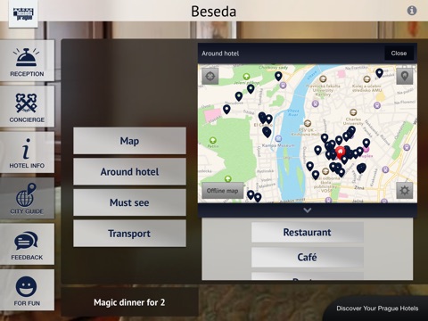 Use this Application to be informed about the Special Offers, News, Culture Events in Prague. See where to go to drink best Coffee or preorder Lunch or Dinner. Find the best and easiest way how to get to the Hotel by using the function Transport or Quickly back to Hotel. In the section Guide choose the right destination and let the Aplication navigates you there. Take a headphones and play the Audioguide that describes you interests of the Prague`s monuments. Call or chat with reception to be in touch with hotel even You are outside.