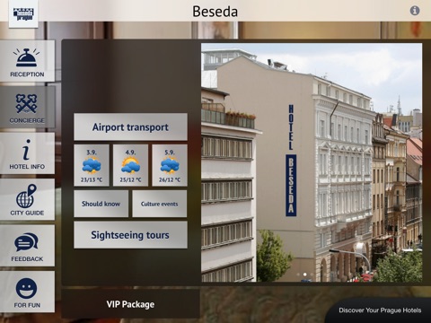 Users of Hotel Beseda Prague Application get many useful information about the accommodation, services and their stay in Hotel Beseda Prague. Through the guide they can easily discover the best places in Prague.