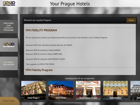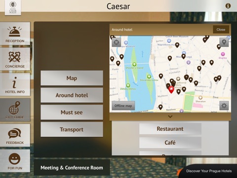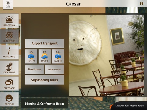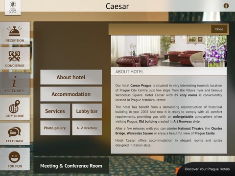 Users of Hotel Caesar Application get many useful information about the accommodation, services and their stay in Hotel Caesar. Through the guide they can easily discover the best places in Prague.