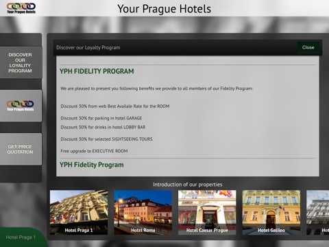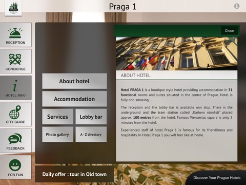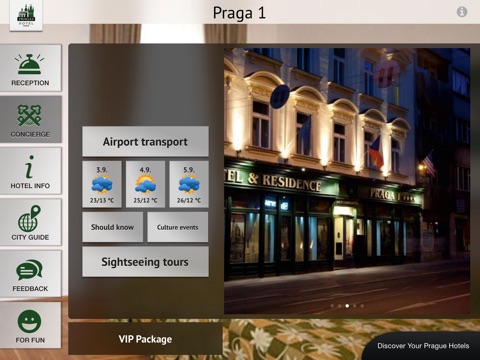 Use this Application to be informed about the Special Offers, News, Culture Events in Prague. See where to go to drink best Coffee or preorder Lunch or Dinner. Find the best and easiest way how to get to the Hotel by using the function Transport or Quickly back to Hotel. In the section Guide choose the right destination and let the Aplication navigates you there. Take a headphones and play the Audioguide that describes you interests of the Prague`s monuments. Call or chat with reception to be in touch with hotel even You are outside.