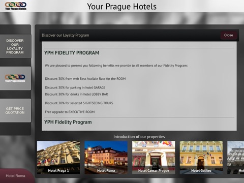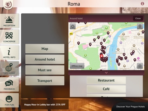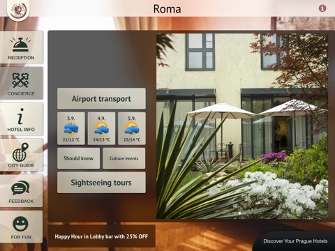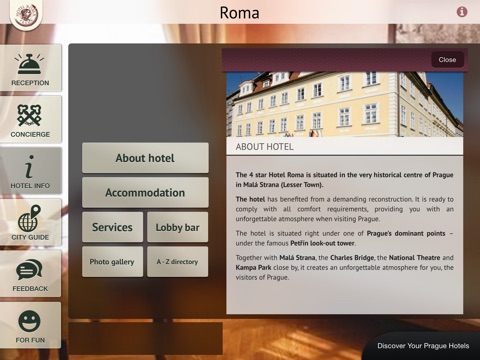 Users of Hotel Roma Application get many useful information about the accommodation, services and their stay in Hotel Roma. Through the guide they can easily discover the best places in Prague.