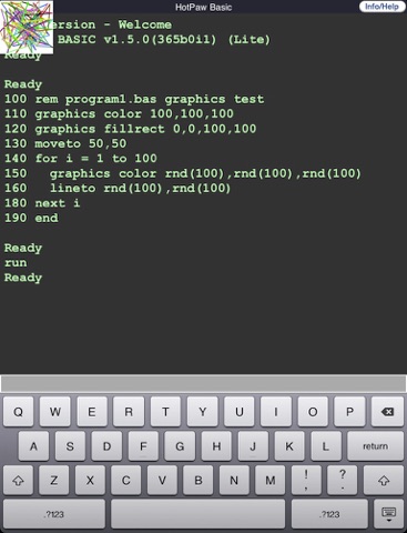 Every personal computer used to come with a built-in easy-to-use programming language for educational purposes and simple calculations. HotPaw Basic (Lite) is a Tiny Old-Fashioned BASIC interpreter which allows you to type in and run very short Basic programs right on your iPhone, iPad or iPod Touch.