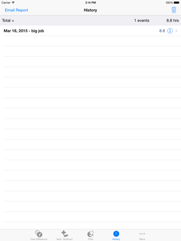 A new feature for V3.0 is the addition of the “History” tab. This allows blocks of time to be saved to a list that can be emailed in text format or comma separated format to allow easy import into spreadsheets. Times can also be saved to the devices calendar.