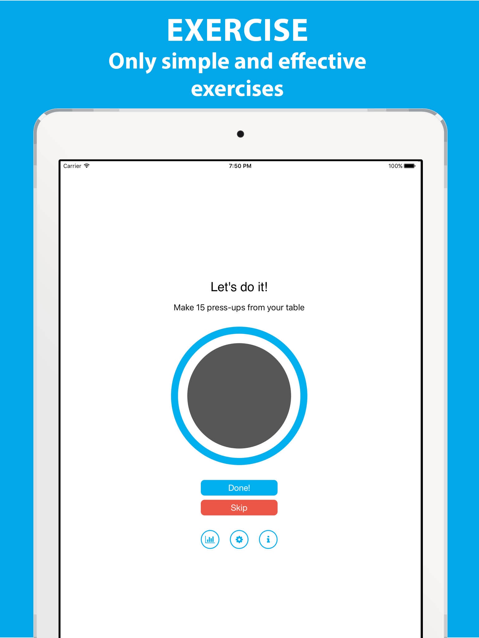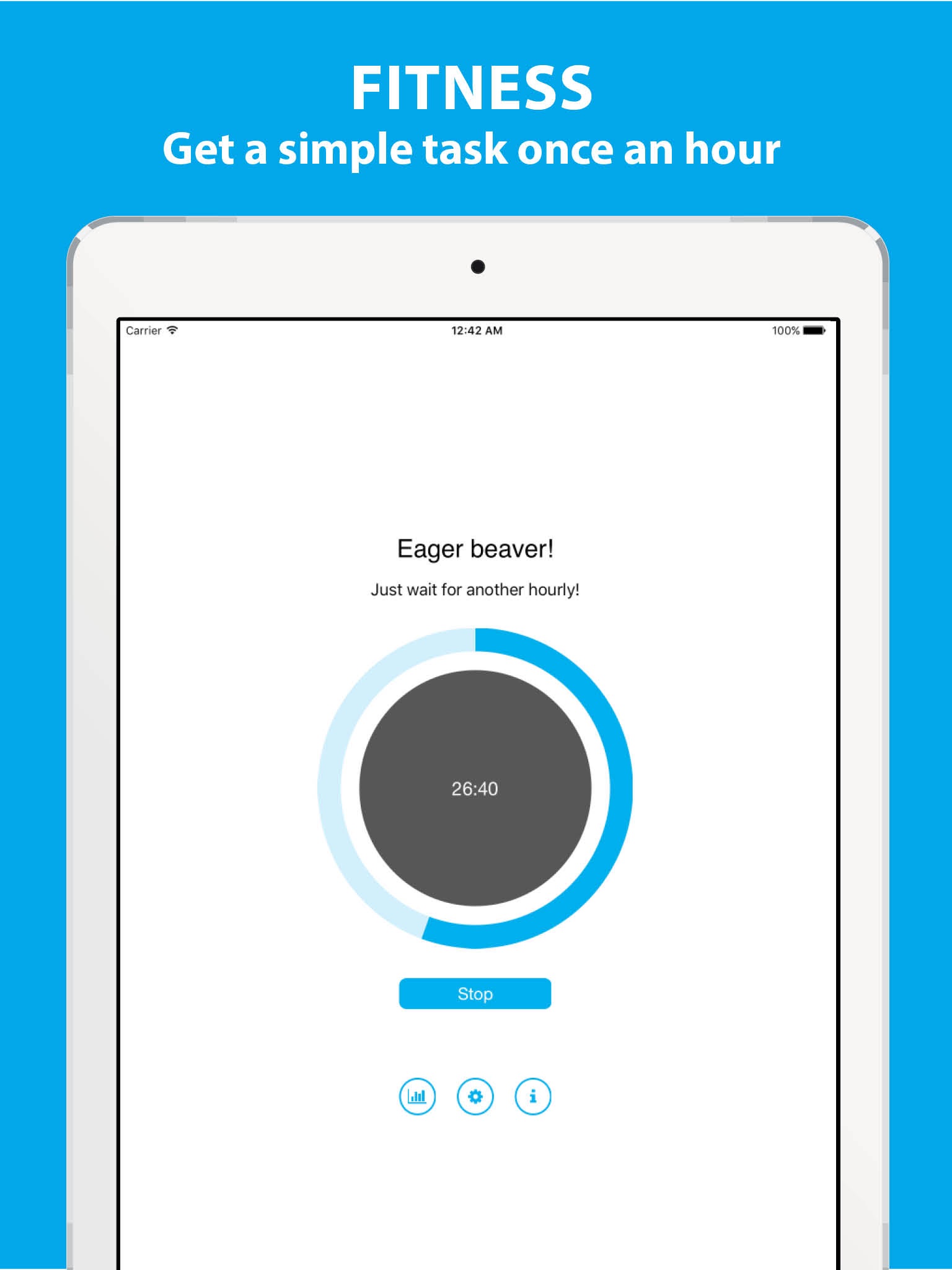 Even 20 minutes of physical activity will help you to increase your fitness level and health. Hourly Fitness will remind you to make a simple exercise every hour and will motivate you to do that. It is very simple and fun!