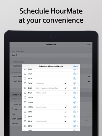 • Set on/off for each hour. So its up to you if you dont want to be disturbed on your sleeping time, or if you want HourMate to alert you in every 2, 3, or 6 hours.