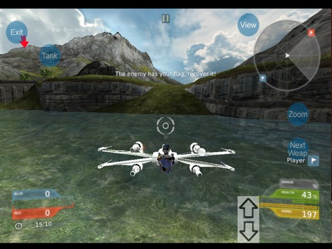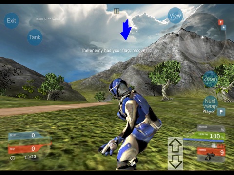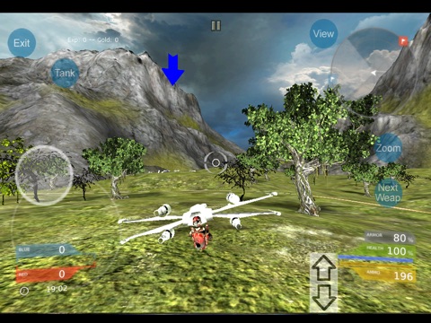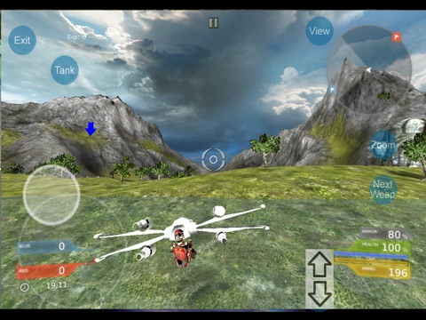 Vehicle based Capture the Flag game, 6v6, Red vs Blue - On foot or in High speed hover jet vehicle (with missile launchers), allows you to navigate the environment with speed and freedom onscreen joystick and screen swipe aim and tap with an array of weapons.