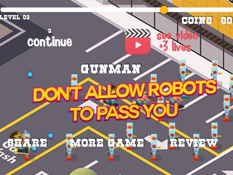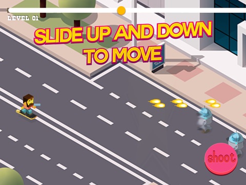 Slide up and down to move and tap on the shoot button to fire on the robots. While collecting the points and getting ahead, you will discover the new exciting levels to make more points and beet your friends online. Just, don’t allow the robots to pass you through.
