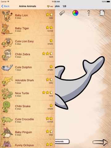 After installing Draw and Coloring Anime Animals from cartoons on your gadget, you’ll need to choose an interesting pattern for yourself. Then just repeat the instructions step-by-step. So the image will be created gradually. You can draw anywhere and on anything: on the school board, paper, window glass and even on the wall.