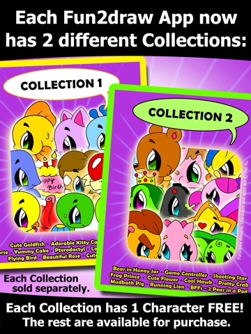 Collection 1 and Collection 2 each come with a free character, ready for you to draw and color right away. Plus, in each Collection, a set of 9 additional brilliant cartoon characters are available for you to purchase to complete that Collection! Please note that each Collection is sold separately. You must have internet connection for in-app purchases.