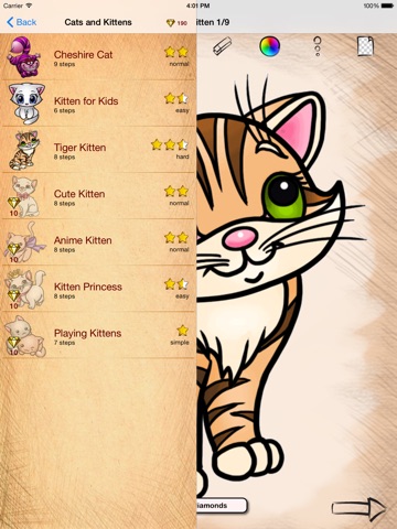 After installing Draw and Coloring popular Cats on your gadget, you’ll need to choose an interesting pattern for yourself. Then just repeat the instructions step-by-step. So the image will be created gradually. You can draw anywhere and on anything: on the school board, paper, window glass and even on the wall.