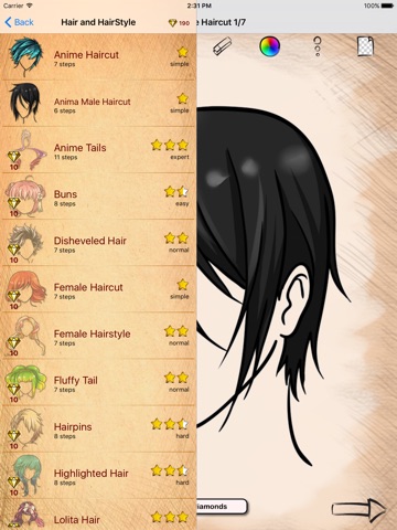 Every lesson of Hair and Hairstyles drawing app has its own level. So it will be interesting for everyone, both for kids and adults. You will find various anime Hair here, and the most various Hairstyles!