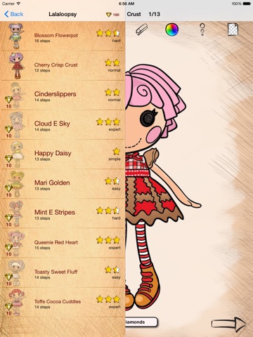 After installing Draw and Coloring Lalaloopsy Girls on your gadget, you’ll need to choose an interesting pattern for yourself. Then just repeat the instructions step-by-step. So the image will be created gradually. You can draw anywhere and on anything: on the school board, paper, window glass and even on the wall.