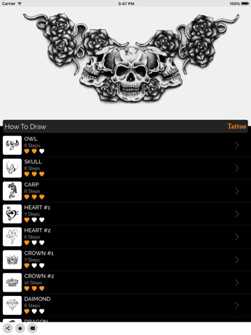 Learning to draw tattoos with the How to Draw: Tattoos Designs app consists of you following along with each step presented in the tutorial for the subject you want to learn to draw. The number of steps varies, but each one covers a key aspect of the subject. Even complex subjects such as butterfly, flower, heart, and scorpion are a snap!
