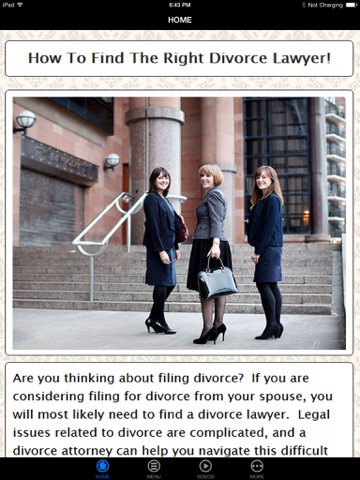Finding the right divorce lawyer for your divorce is more than just blindly pointing your finger at the first family law advertisement you see in the yellow pages. The stress that divorce battles bring to parents can be truly remarkable. Your divorce lawyer will either add to your frustration or ease the pain. This App will guide to consider when looking for a divorce lawyer.
