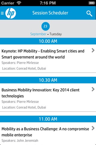 This is an event app of HP Mobility Event 2014 - Middle East which enables users to view details of company event. They can view event agenda, event sessions, speakers and other related information of event. They can register themselves for attending event and add event sessions to their own schedule and device calendar.