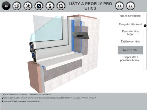 Interactive 3D real time presentation of company products associated with thermal insulation of buildings. Focused on window- and facade-related details, offers step-by-step 3D animated assembly workflow closeups with Orbit, Zoom, Pause and Replay features. High-detailed view of every product line sample and more information in user-friendly environment included.
