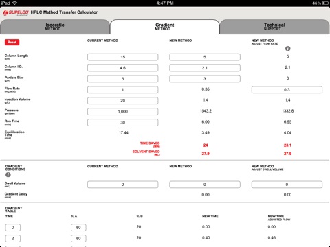 ● Calculates conditions for transfer of an isocratic or gradient method from one HPLC column to another.
