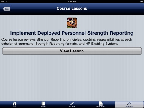 The goal of the App is to assess and then assist incoming students in their technical knowledge of the course material, allowing the resident course the ability to conduct learner centric facilitated instruction. Upon graduation from the course students will have a kit bag of training material for personal sustainment/refresher training as well as material to conduct unit training.