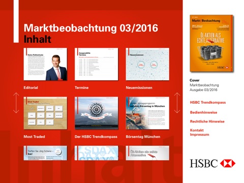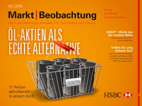 Die Marktbeobachtung ist das kostenfreie Kundenmagazin von HSBC für Investoren und Trader. Die monatlich erscheinenden Ausgaben enthalten regelmäßig Analysen der Experten von HSBC Deutschland. Unter fundamentalen und charttechnischen Gesichtspunkten nehmen die Analysten sowohl die globalen Indizes und Aktien als auch die Entwicklung von Rohstoffen, Edelmetallen und Währungen unter die Lupe.