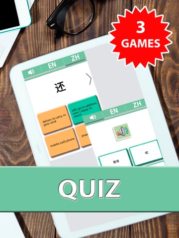 • Words game/ quiz. Three mini games and quizzes to help you memory the words and test your level of speaking Chinese.