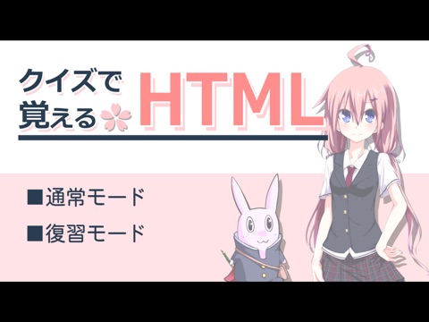 クイズゲーム形式でHTMLのお勉強ができる学習アプリです。問題は全部で100問、HTML5の問題もたくさんあります。