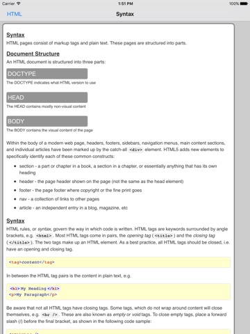 The HTML tags are categorized and searchable. Each tag information screen contains a description, element specific attributes, examples, browser compatibility, and version information. In addition, many of the examples include the actual rendered output.