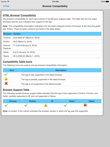 The HTML tags are categorized and searchable. Each tag information screen contains a description, element specific attributes, examples, browser compatibility, and version information. In addition, many of the examples include the actual rendered output.