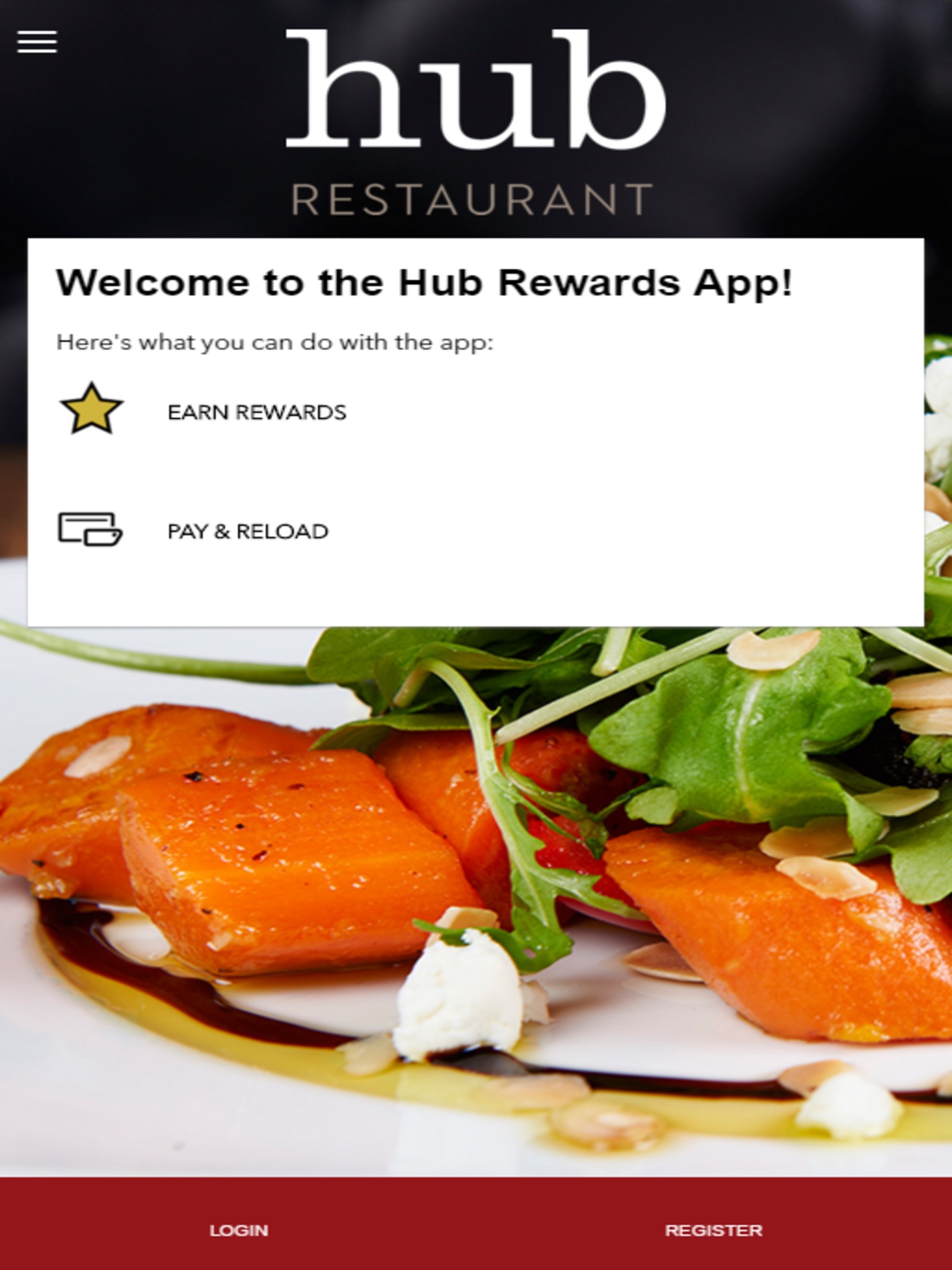 The official Hub Restaurant app allows you to earn cash back and rewards at all Hub Restaurant locations. Build progress towards our different tiers to earn more cash back and bigger rewards. Receive $5 in app just for signing up!