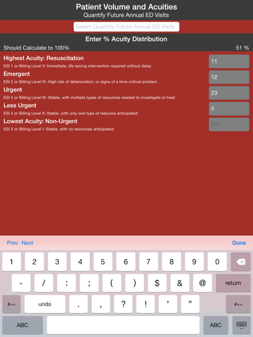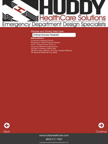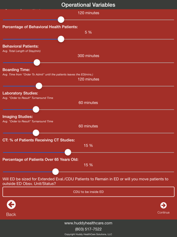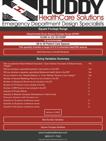 The Huddy ED SizeIt app takes you through multiple screens that allows you to document your unique patient care data, operational variables, and additional space variables for such items as in-department imaging, staff support areas and administrative offices. Based on your unique data, patient types, future volume projections, and sizing variables, the app will define a range of patient care spaces and overall departmental gross square footage. This is an excellent tool to start your planning process as you begin to set the appropriate scope for your future emergency department project.