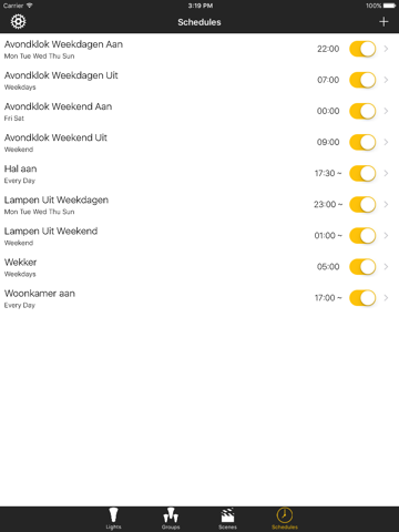 With Scenes you can save your personal recipes so you can recall those at any time or even schedule them at a specific or random time with Schedules!