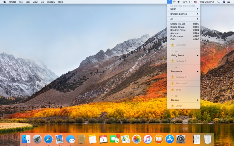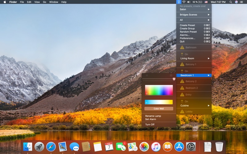 -Change the colors of your individual hue lamps from the color charts in the main menu or from the traditional Mac OS color Picker (Color Wheel, RGB Sliders, Gray Scale Slider, HSB Sliders, CMYK Sliders, Crayons).