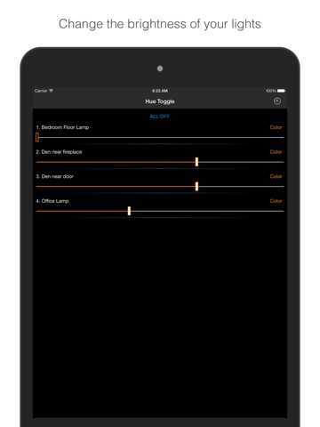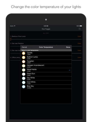 Quickly turn on and off or adjust the brightness of your Philips Hue lights. Change the color of your lights by selecting a from a list of popular colors in the kelvin temperature scale.