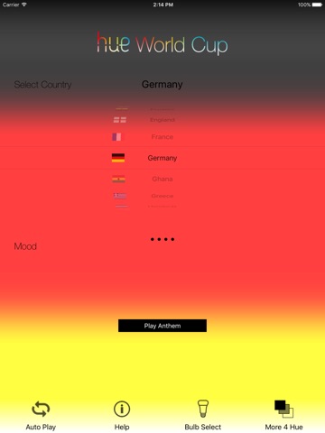 Hue World Cup will color your room based on the country of choice. Colors from your countrys flag and team shirts are used to create a perfect mood for Hue!