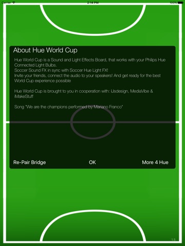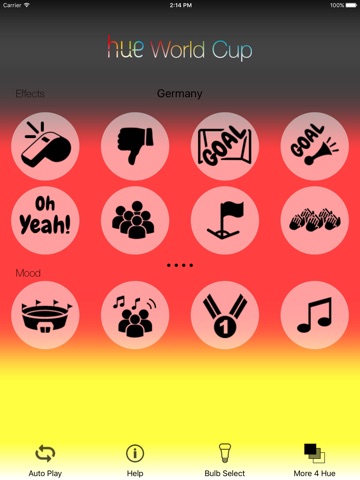 Hue World Cup can play your own favorite team music from your device library or choose from some nice soccer ambient sounds together with sound effects of crowds, horns, applause and much more. You can even play all the teams Anthems and your Hue lights will accompany it with a lightshow in the colors of the country.