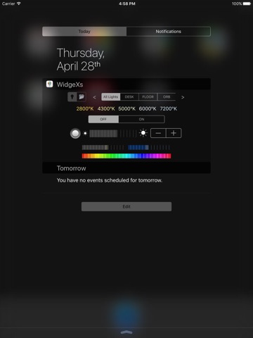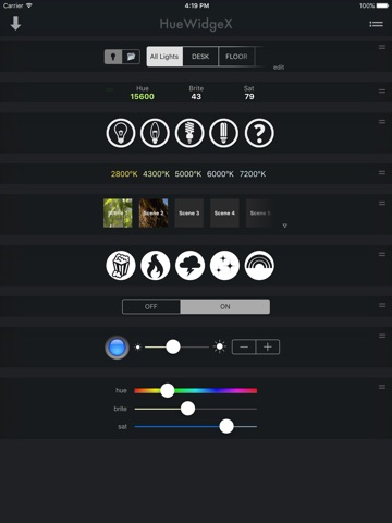 Introducing HueWidgeX! Now you can control your Philips Hue lights YOUR WAY. Whether you prefer scenes, effects or total control, HueWidgeX has you covered. Select and rearrange various WidgeXs to customize your Hue experience. WidgeXs include a switch, dimmer, effects, scenes and many more! All WidgeXs are also available to be used as a widget in the Notification Center and mimic the apps configuration. New WidgeXs will be added for endlessly improving functionality. With HueWidgeX, the possibilities are infinite. Your Hue, Your Way.