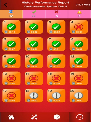 - You can review a quiz session performance details by selected a session. This screen shows quiz history performance reports.