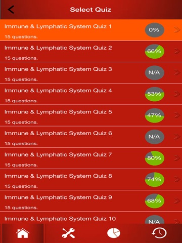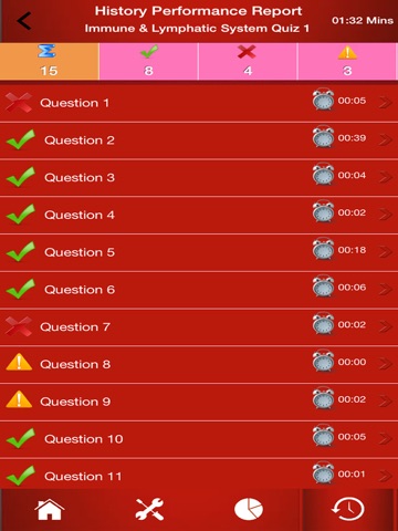 - You can review a quiz session performance details by selected a session. This screen shows quiz history performance reports.
