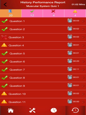 - You can review a quiz session performance details by selected a session. This screen shows quiz history performance reports.