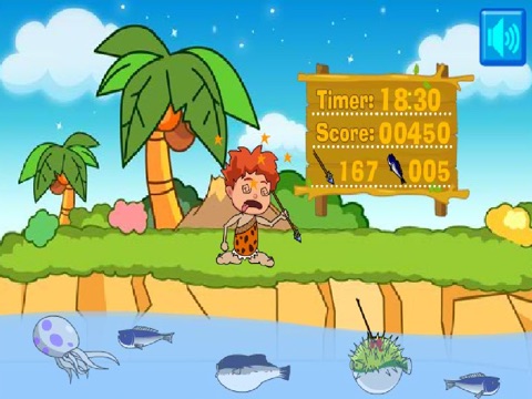 A little wild boy is fishing in a river,dreaming of catching fish,try to help him catch as many fish as possible. The wild boy has 200 spears and 10 minutes left to catch fish,if he runs of time or spear,game over!