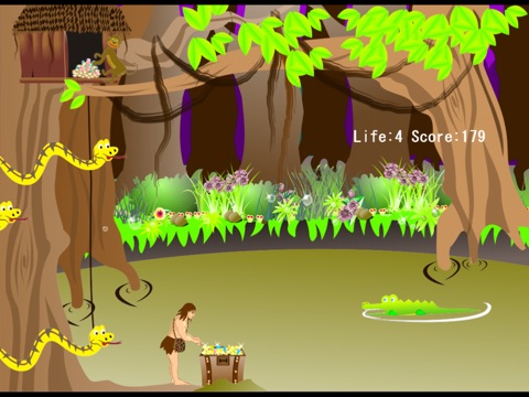 Your job is to bring back as many treasures as you can to your tree house, without getting bitten by the snakes, and the crocodile!!
