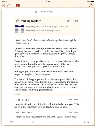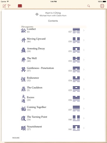 The Hurns I Ching app follows this sequence. Thus you can look up a hexagram by flicking through the table of contents. But this being an app you can also take advantage of the unique features of your mobile device.